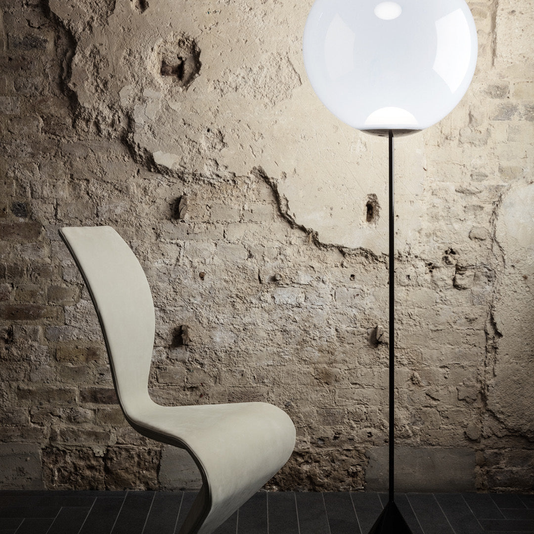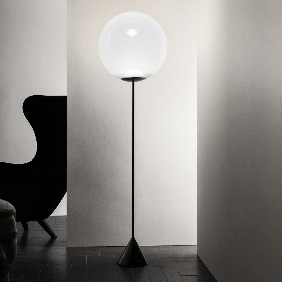 The Globe Cone Floor Lamp by Tom Dixon is part of a family of translucent globes using a custom recipe of tinted white Opalescent polycarbonate. Semi translucent, they maintain an ethereal ghostliness in the daylight and at night form a perfectly illuminated sphere. Featuring the Tom Dixon LED system, this Opal finish range emits a soft, diffused and flattering light. The softness of the lightbulb shape is achieved through a blow-moulded orb which achieves an organic form as well a delicate translucency. The Globe family in Opal also includes 25cm and 50cm diameter pendants, a surface light, as well as pendant systems.