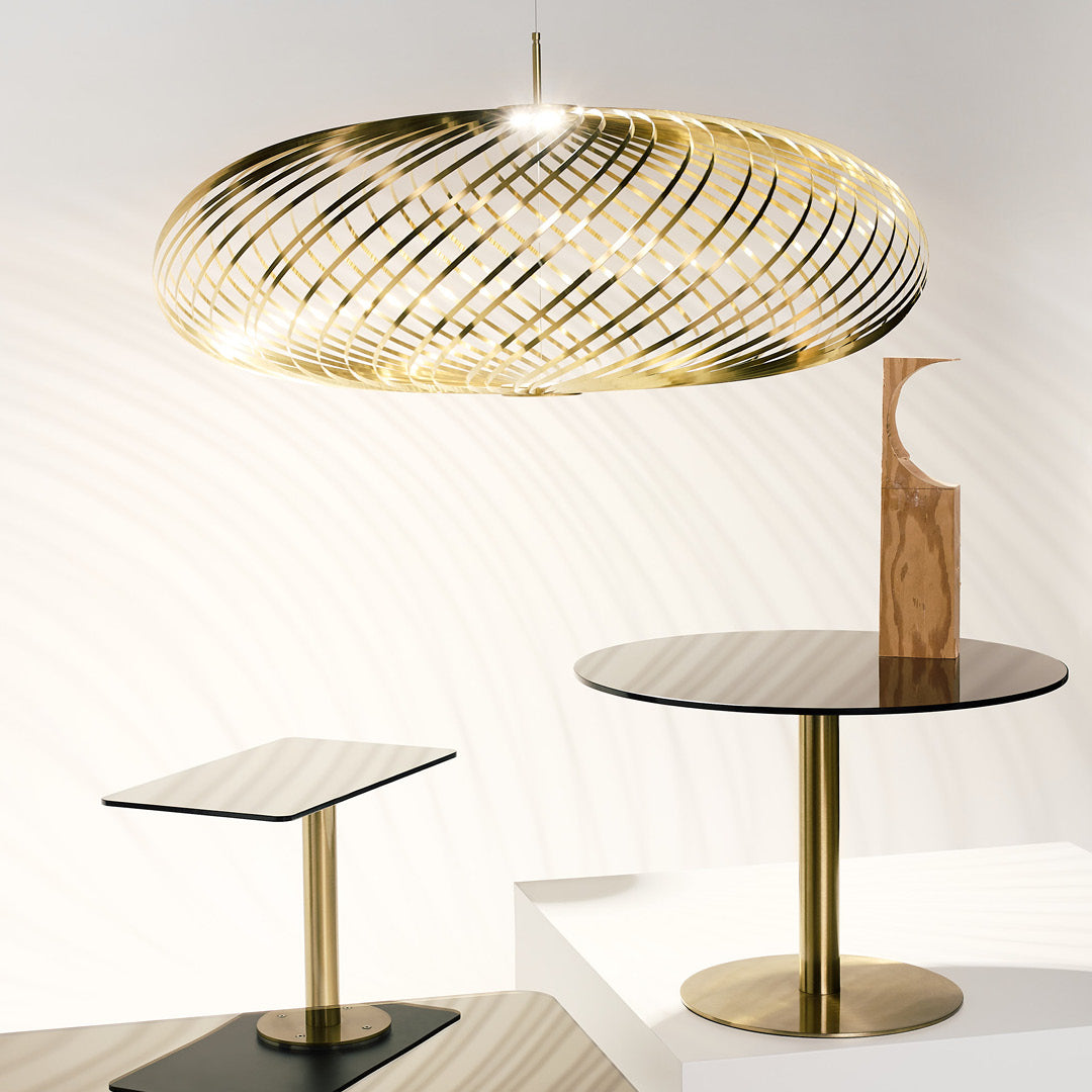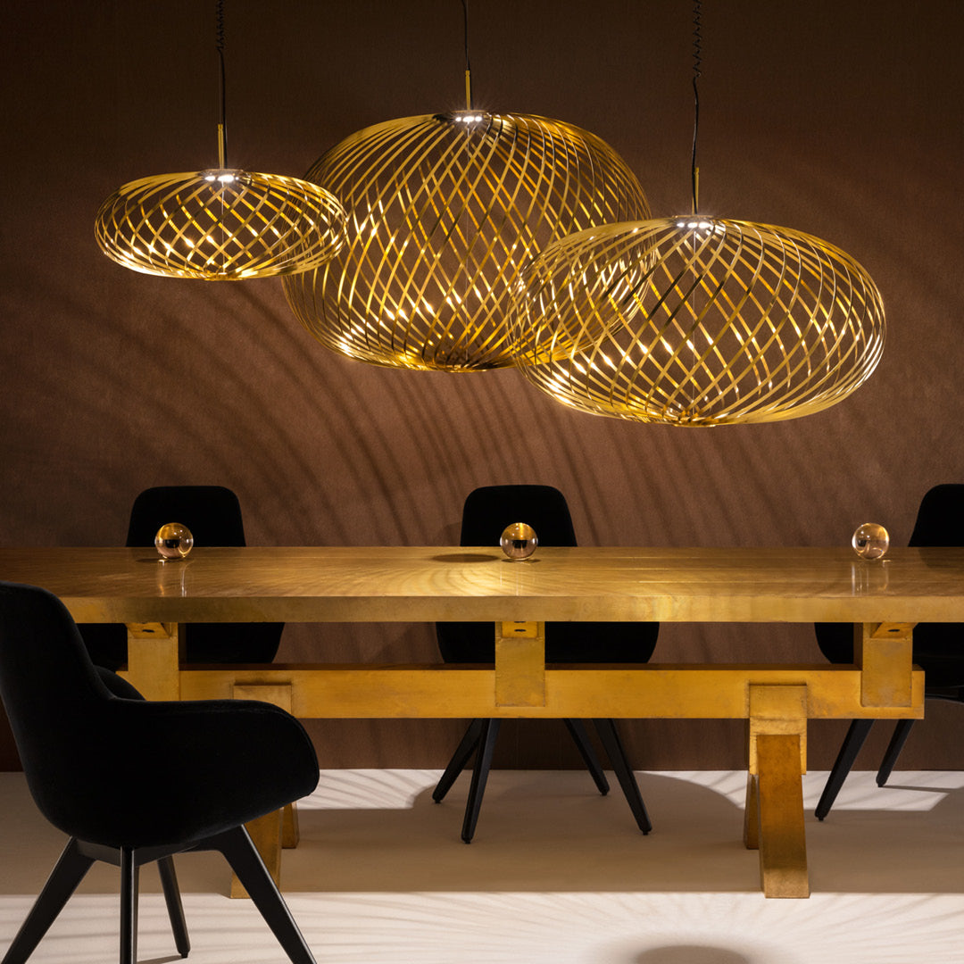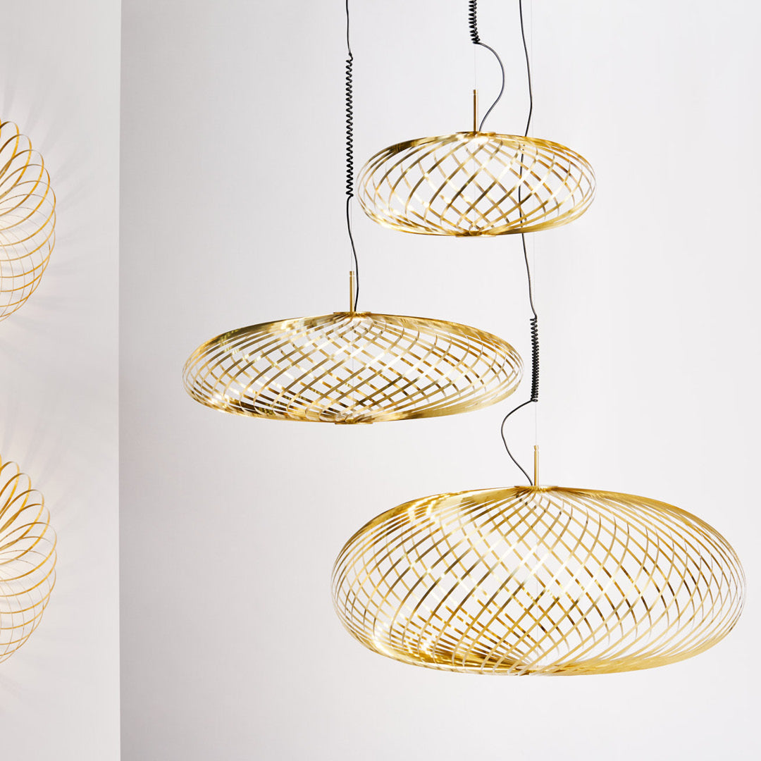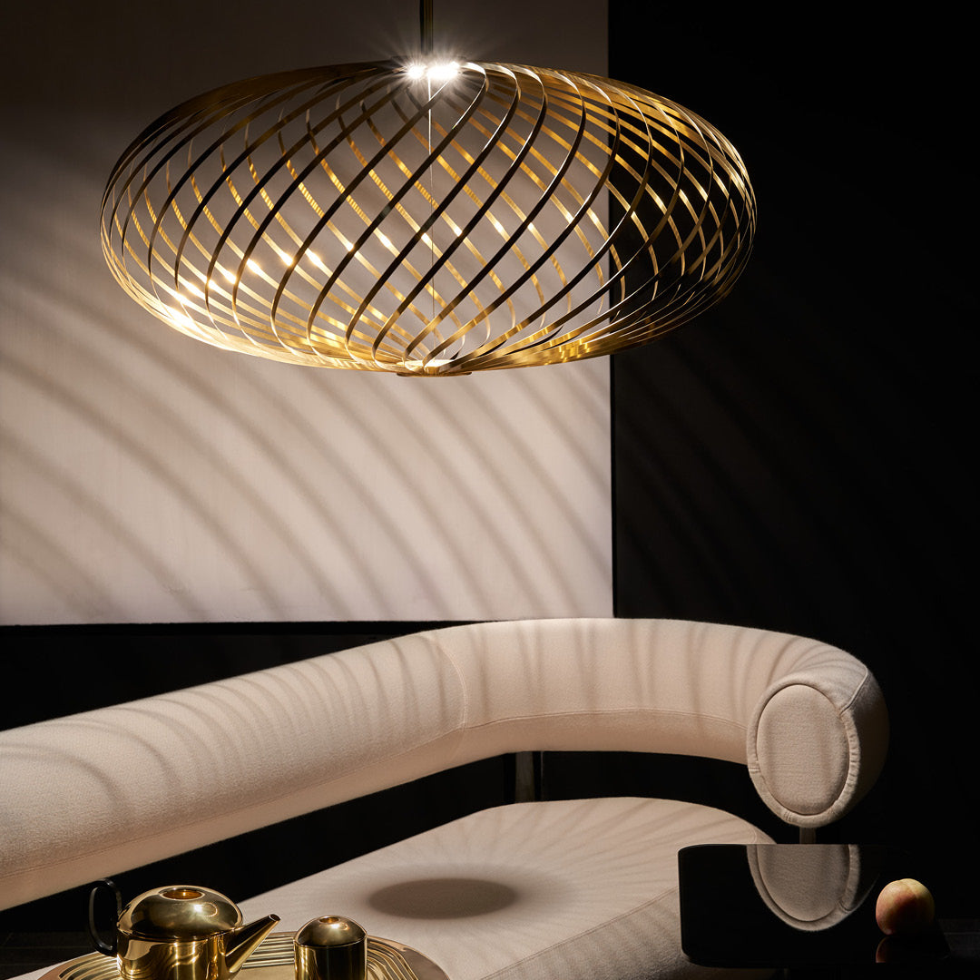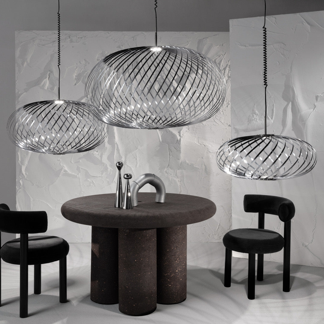 The Spring Pendant is a series made up of pliant ribbons of stainless steel metal that have been arranged like a whisk around the custom-made dimmable Tom Dixon LED module. The semi-transparent shape it creates can be adjusted to a variety of silhouettes - from a flat arrangement reminiscent of a spirograph drawing, to a flying saucer configuration and on to a fuller shape akin to a pumpkin. Available in three sizes (Small, Medium and Large), Spring is available in Brass and Silver finish.