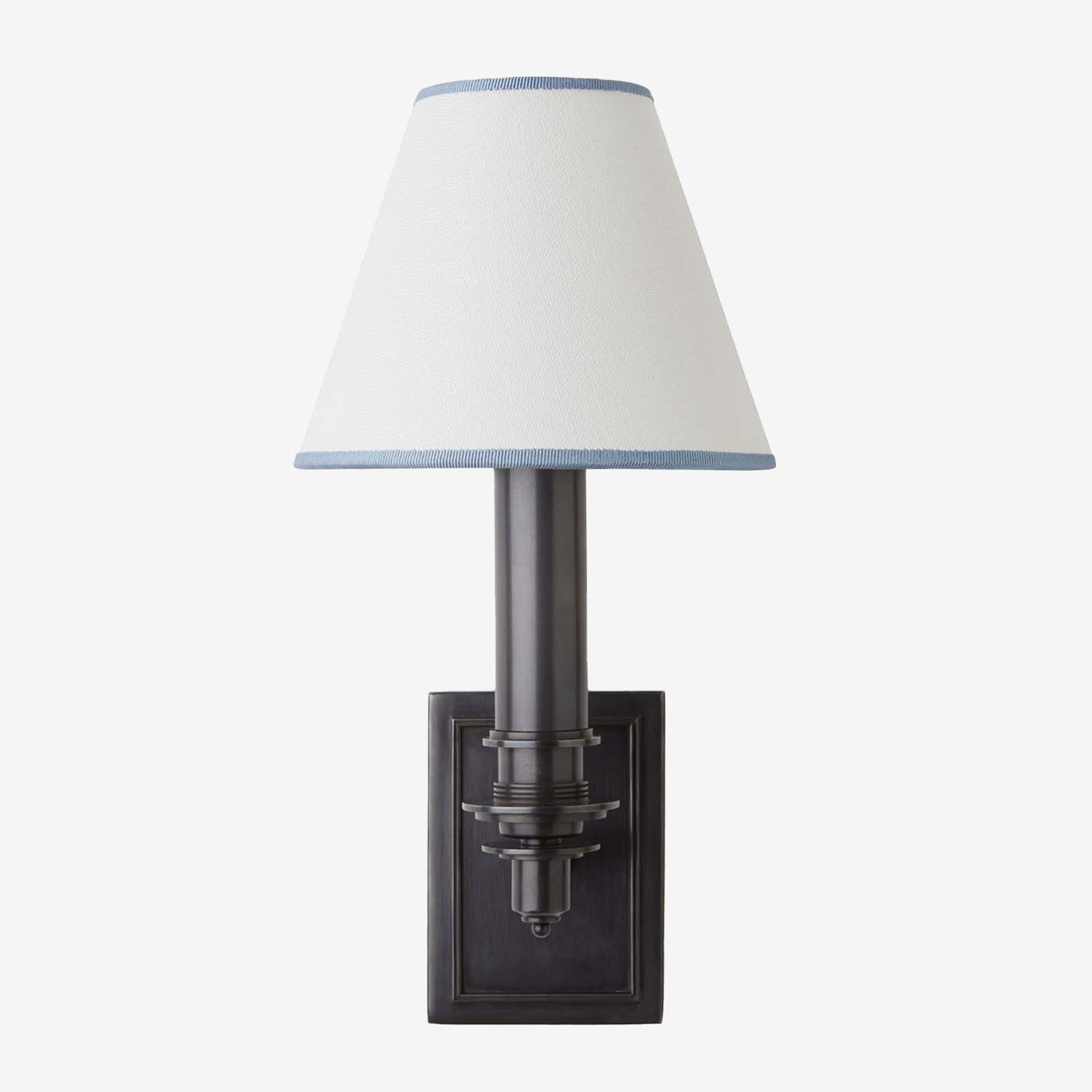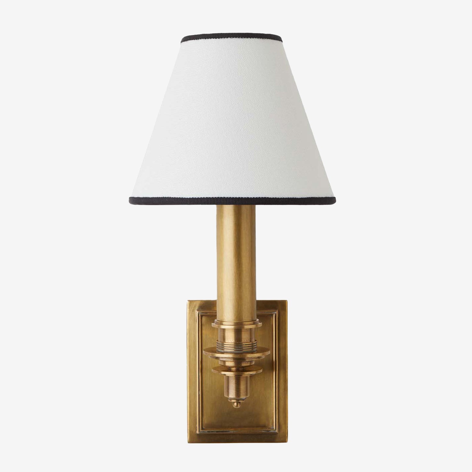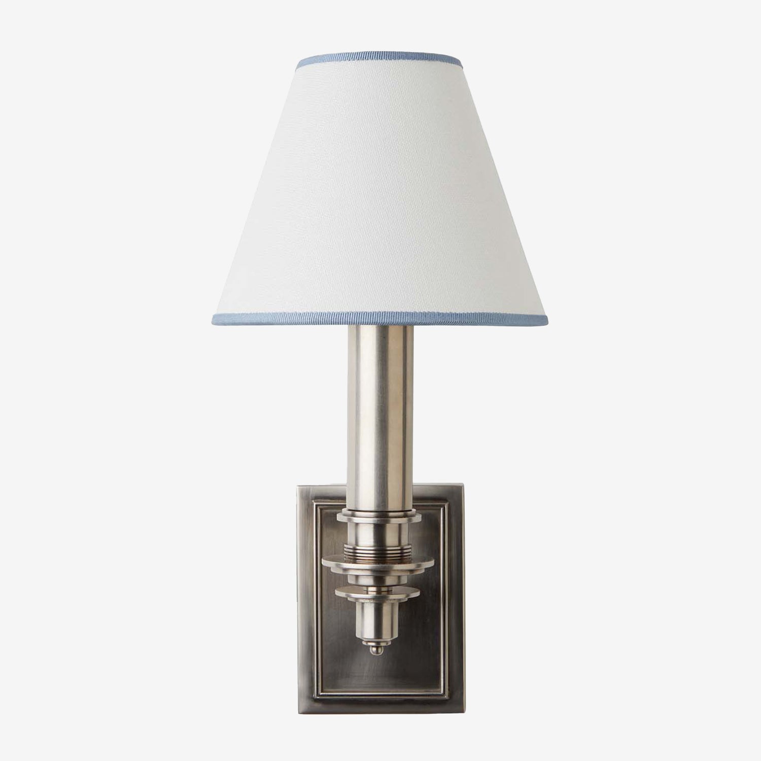Each sconce features a crisp white linen shade, finished with grosgrain ribbon trim in four signature Diane Bergeron colours. The sconce is available in three finishes - Bronze, Antique Silver, and Antique-Burnished Brass - chosen to complement a wide range of interiors.