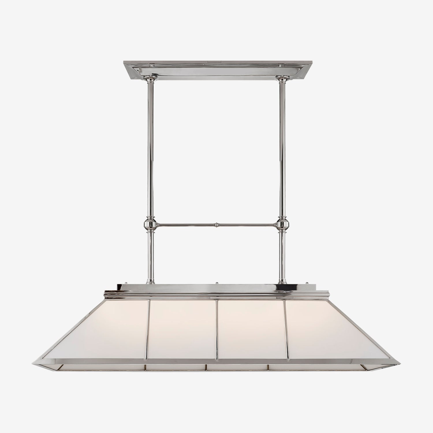 Part of the Ralph Lauren Rivington Collection, the Rivington Large Billiard Chandelier embodies industrial-inspired style with its sleek frame and detailing featuring White Glass panels.