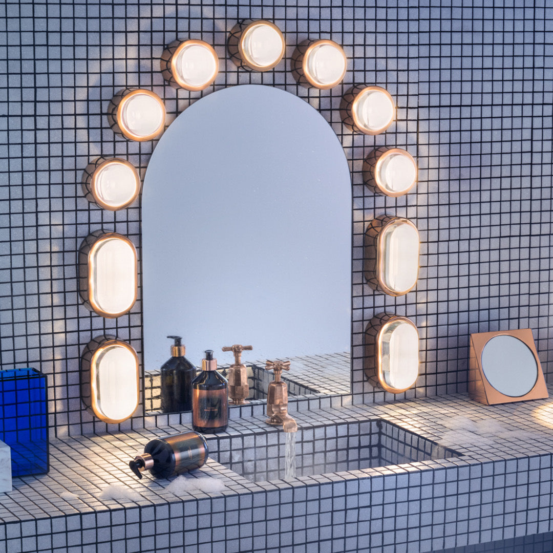 Highly functional and unexpectedly decorative, the Spot Surface Light by Tom Dixon features a high-shine, gold-plated stainless-steel surround. A stunning, thick glass lens designed to refract the light of integrated LEDs, is a standout. Made from K9 glass, liquid glass is poured into an iron mould, cooled down and then polished by hand. Rated IP44.