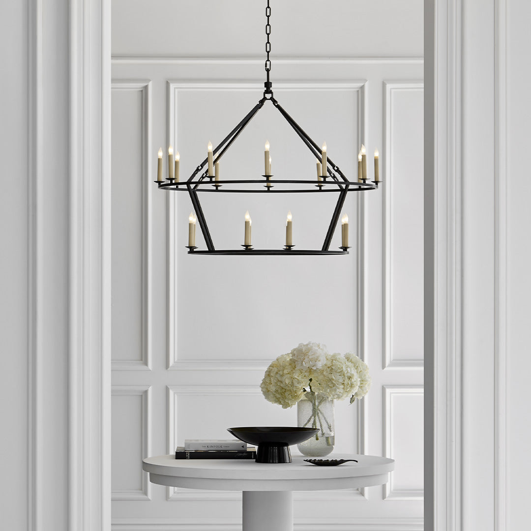 The classic Darlana has been transformed into a statement-making chandelier, the Darlana Large Two-Tier. With geometric shapes and a touch of industrial, the modern silhouette with classic candle style lighting is a perfect option to warm a large open-plan space.