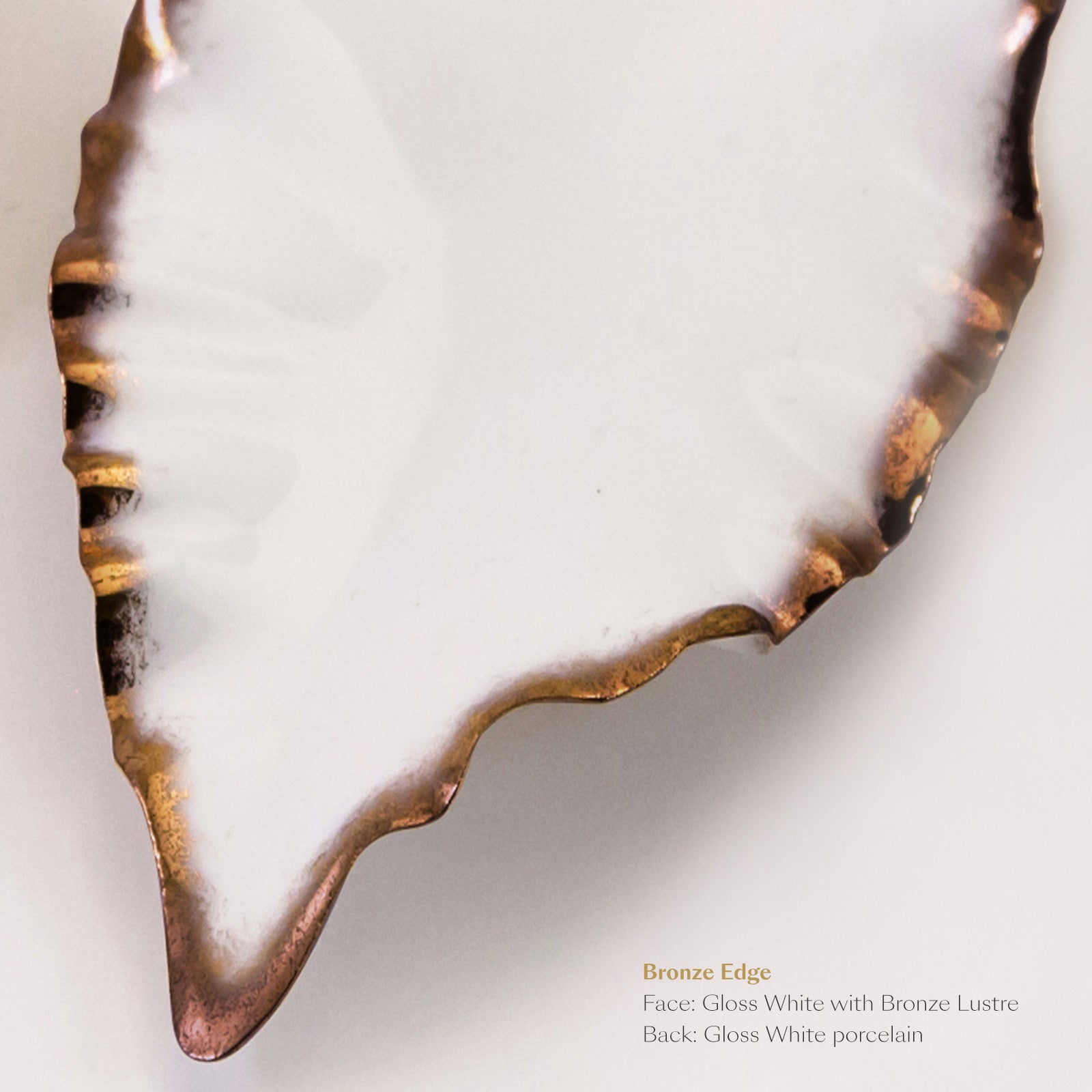 The leaves are delicately suspended in elegant formations from minimal ceiling plates and lit by integrated downlights to activate a complex artistic lighting effect through reflections and shadows. The leaves themselves are available in a selection of finishes including 14 karat gold, bronze or platinum lustres, and pure white glaze.